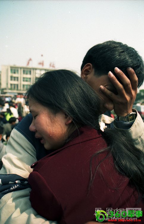 2003年,广州火车站,一对遗失了钱和车票的夫妻相拥而泣。