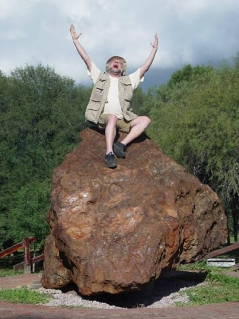 一名游客与艾尔·查科陨石合影留念。他双手举向天空,看上去非常兴奋。