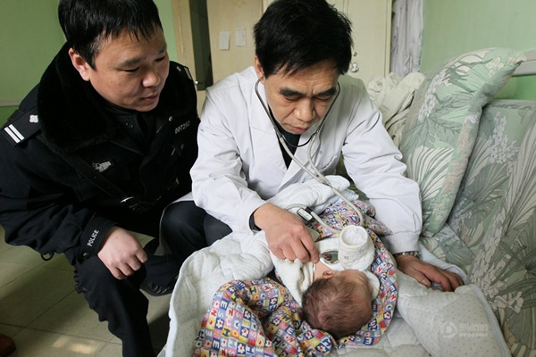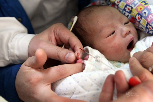 给男婴采指尖血。