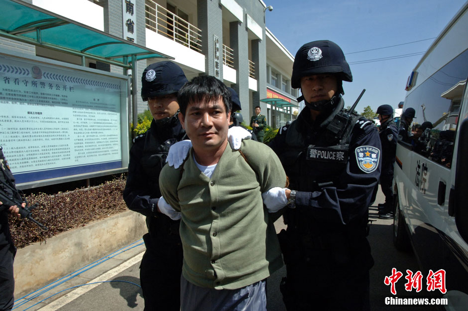 3月1日,根据最高人民法院院长签发的执行死刑命令,云南省昆明市中级人民法院依法对糯康、桑康·乍萨、依莱、扎西卡四名湄公河案罪犯执行了死刑。图为糯康被带出云南省看守所前往行刑地点。