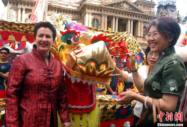 2007年1月29日,时任中国驻澳大利亚大使傅莹与悉尼首位女市长在庆祝中国新年的巡游活动中进行点晴仪式。