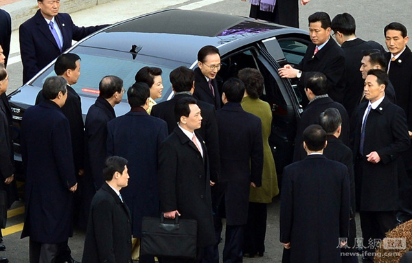 当地时间2013年2月25日,韩国首尔,韩国新任总统朴槿惠在就职仪式结束后坐上汽车。