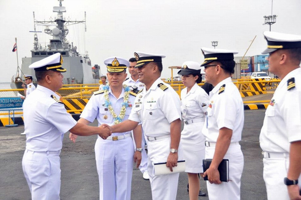 菲律宾海军官员在港口迎接来访的泰国皇家海军