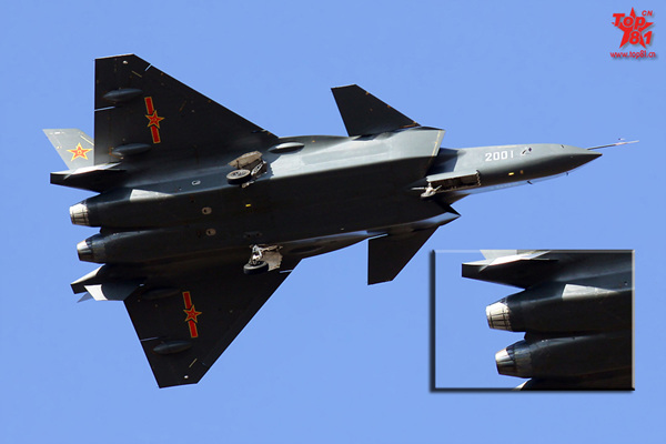 这张照片显示2001号歼-20两台发动机尾喷口收敛调节片呈现不同颜色,推断其至少使用了一台俄产AL-31发动机。