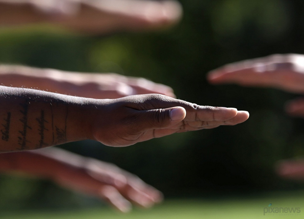 犯人伸臂比量间隔距离。