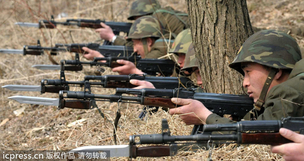 当地时间2013年3月6日,朝鲜平壤,金正日军事大学的士兵举行军演。当天,朝鲜人民军还向媒体公开了射击训练场面。