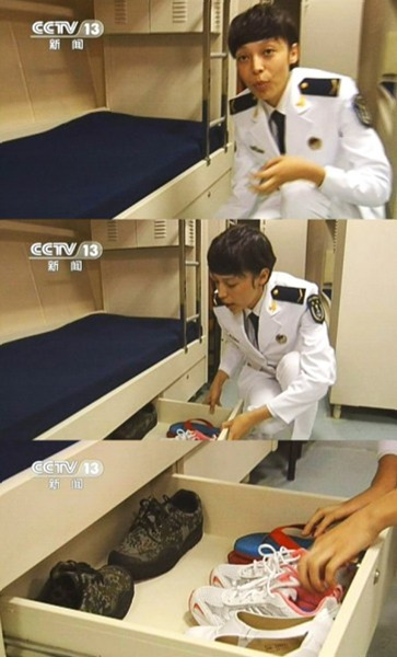 女舰员介绍个人洗漱用品专用柜。