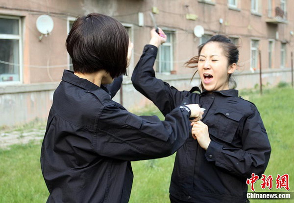 5月22日下午,在南方航空公司吉林分公司训练基地,9名女性航空安全员正在进行特训。据悉,这是东北地区首批女性航空安全员,她们在经过训练后,将于2012年6月正式登机执行任务。图为夺凶器演练