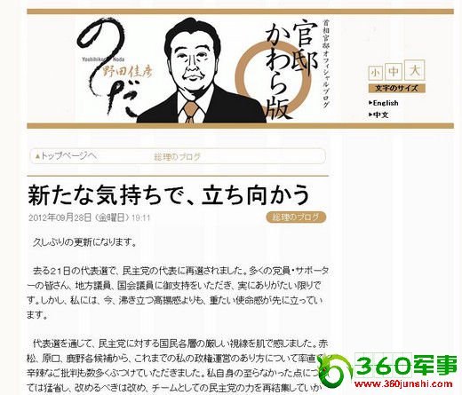 日本首相野田佳彦博客截图